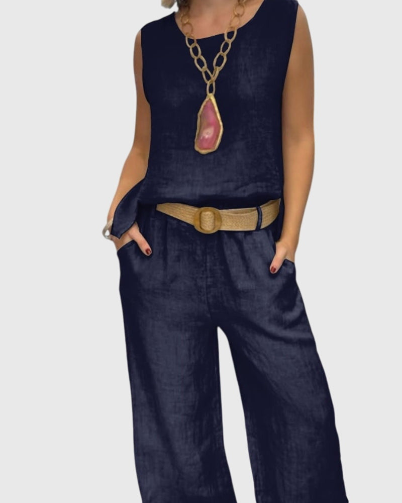 • Bezproblemowa Elegancja: Ten zestaw dwuczęściowy łączy bezrękawnik z szerokimi spodniami, tworząc bezproblemowy, elegancki wygląd.
